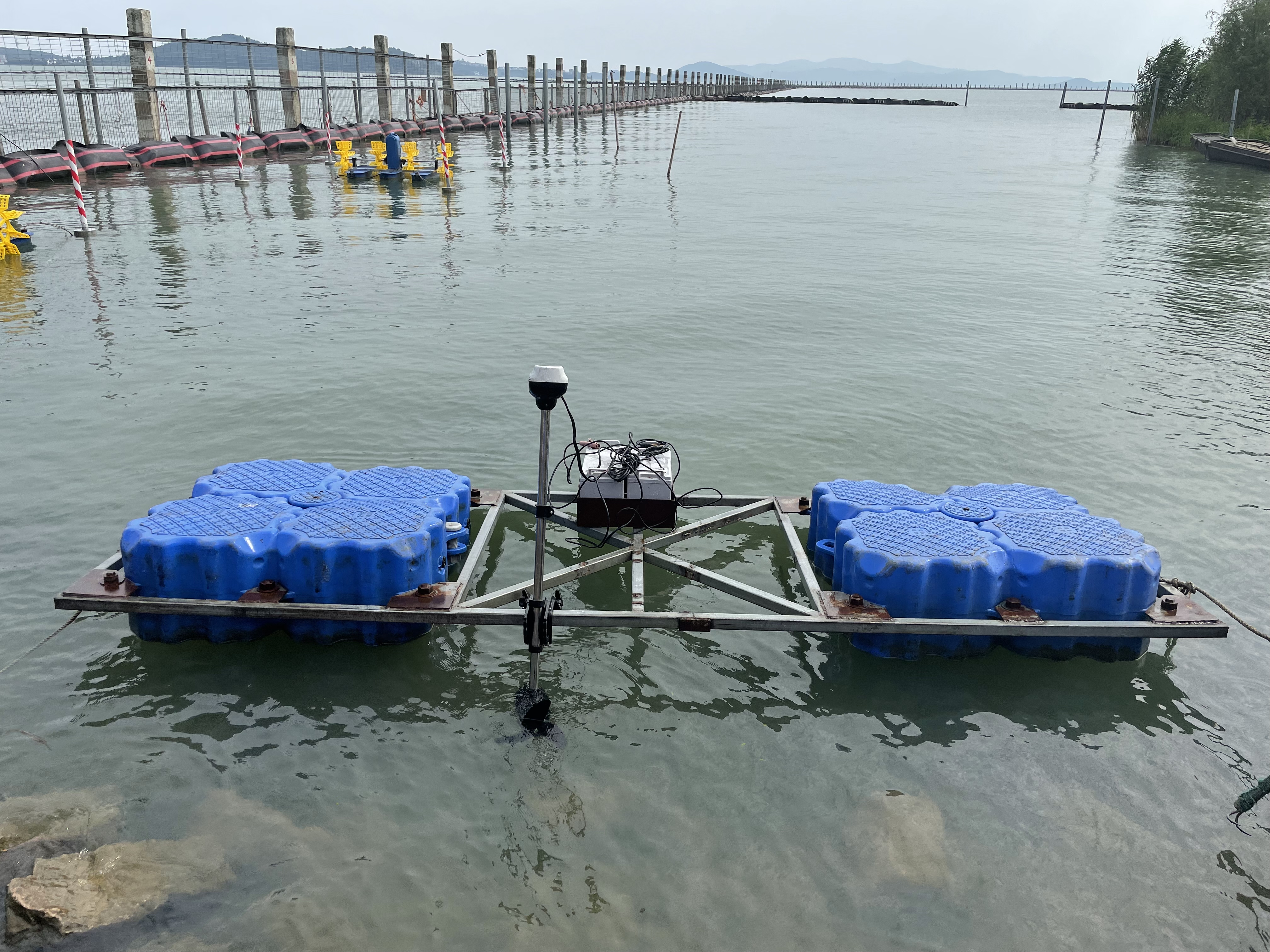 以往,在水源地加裝大量防藻圍隔,雖能在防止藻類入侵時發(fā)揮一定效果,但也易造成圍隔周圍藍藻堆積,甚至影響內(nèi)圈核心區(qū)域的原水水質(zhì)。“工作室”成員潛心研究,將浮筒及電動推流有效組合起來,自主研發(fā)了一款新型防藻電動推流裝置:利用浮筒架起防藻圍隔,然后推流裝置從內(nèi)圈向外將藻類推出,既能有效防控藍藻,又能充分保障水質(zhì)。移動式的推流裝置,與水源地原有的曝氣、固定式推流、防藻圍隔等設備相互支持,為水源地水質(zhì)保障筑牢安全防線。